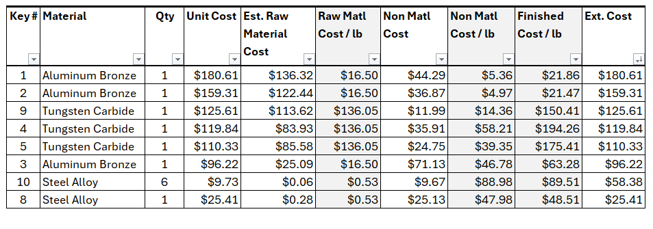 In the choke valve example shown in Figure 3, the raw material cost for aluminum bronze is $16.50/lb, while tungsten carbide is approximately $136/lb. These values explain a significant portion of the observed cost differences. However, when the material cost is removed, a clearer picture emerges. The wear sleeve shows a processing-related cost of approximately $15/lb above material cost, while the front and rear disks exhibit significantly higher processing costs, ranging from approximately $40 to $60/lb above material cost. This refined analysis confirms that the disks are not just expensive due to material, but also due to differences that may be addressed through design or manufacturing changes.