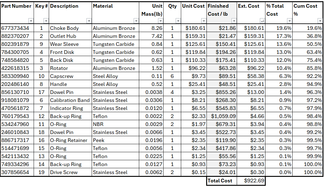 In Figure 2, this ratio is applied to aluminum bronze components within the choke valve assembly. The choke body and outlet hub exhibit cost-to-weight ratios of approximately $21/lb, while the rotator shows a significantly higher ratio of approximately $63/lb. This represents a threefold increase compared to similar components, immediately signaling that something is different. Such a discrepancy suggests that the rotator may involve additional processing complexity, tighter tolerances, or inefficiencies that are not present in the other components. If these factors cannot be justified by functional requirements, the rotator becomes a strong candidate for cost reduction.